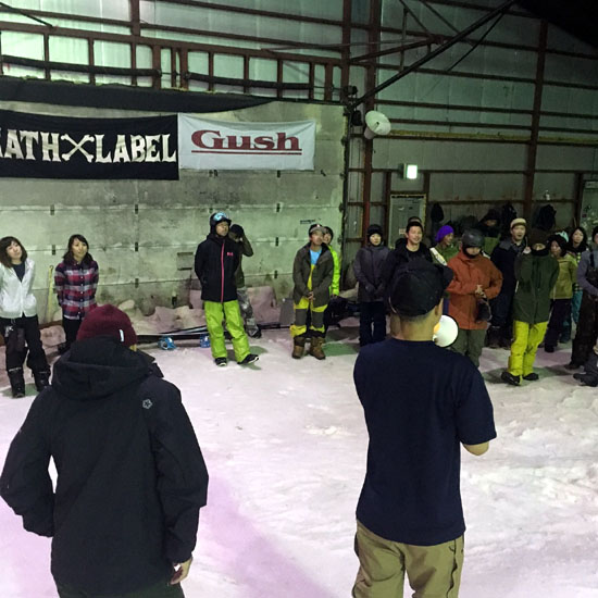 ハーフパイプ内にポールを立てさせて頂き、即席バンクドスラローム・セッションのスタート。