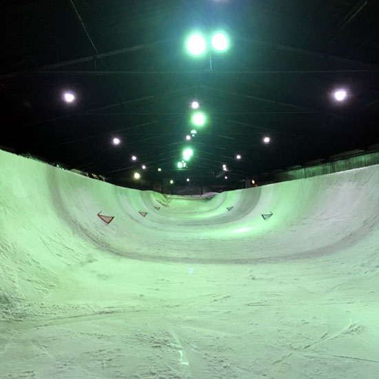 まだ誰も滑っていないハーフパイプは、貸切でもしっかりと整備されていて、