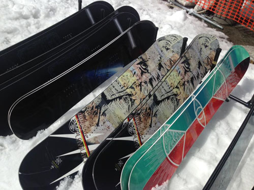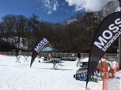 会場にはMOSS SNOWBOARDのフラッグも並び、試乗ボードもずらりと・・・
